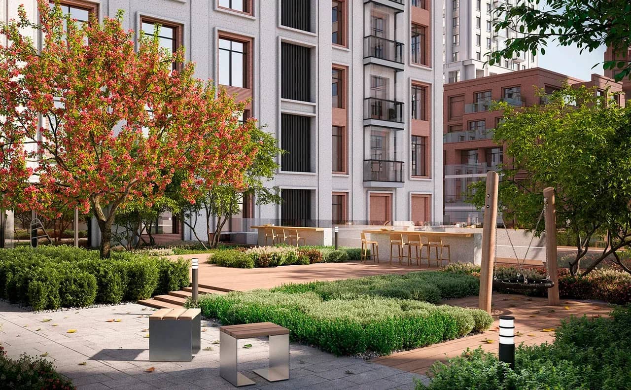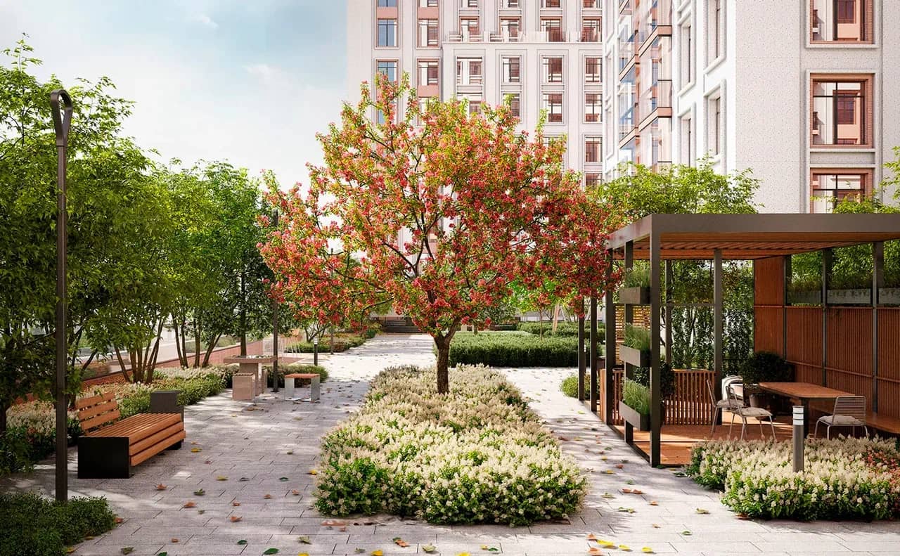 Дворы нашего квартала выполнены в стиле пэчворк, где каждая зона — это яркий и функциональный элемент пространства. Камерные сады с взрослыми деревьями, кустарниками и многолетниками создают уют и спокойствие, делая этот комплекс идеальным выбором для тех, кто хочет купить новостройку в Москве.
